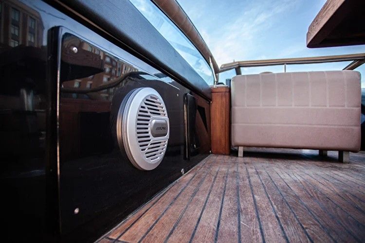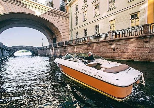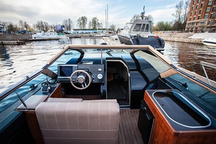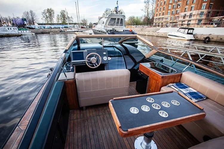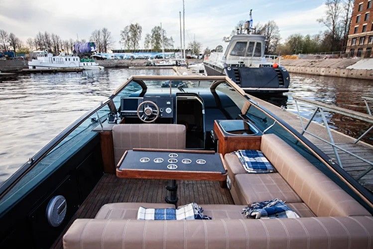Black Boat проходит по всем каналам в СПб, имеет 2 каюты, тент от дождя в случае непогоды, мощную аудио-систему более 600 вт, холодильник, туалет